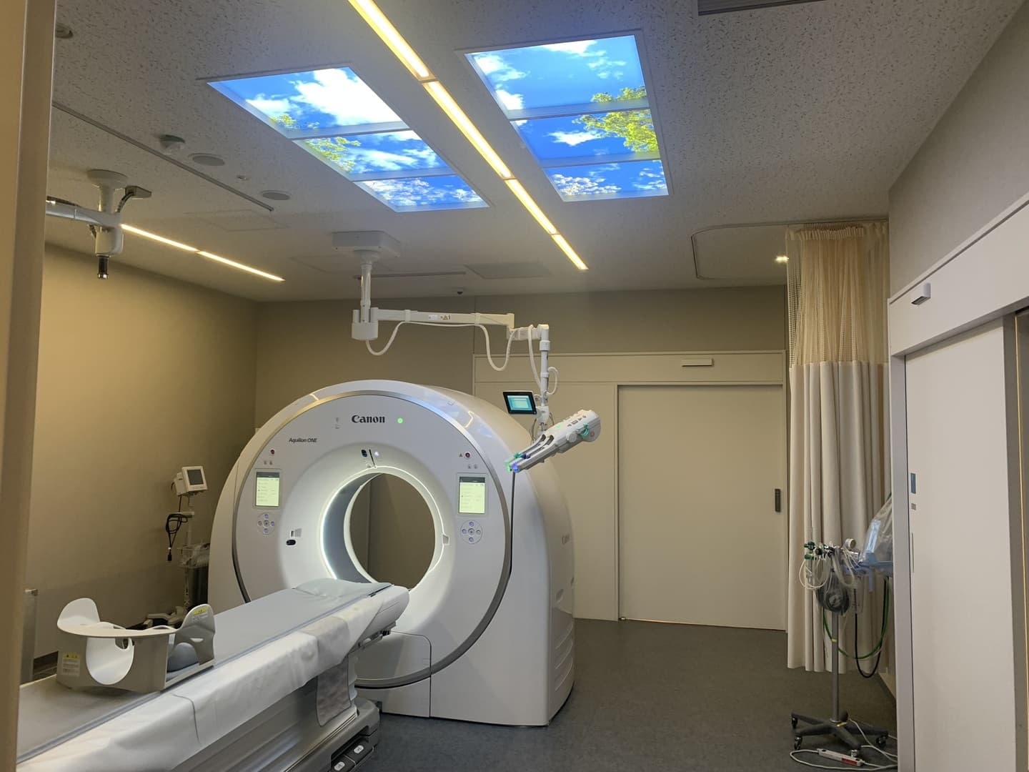 CT室4内の天井には青空の写真をLEDの明るい光で照らす照明(ルミナススカイシーリング)が 設置されています。