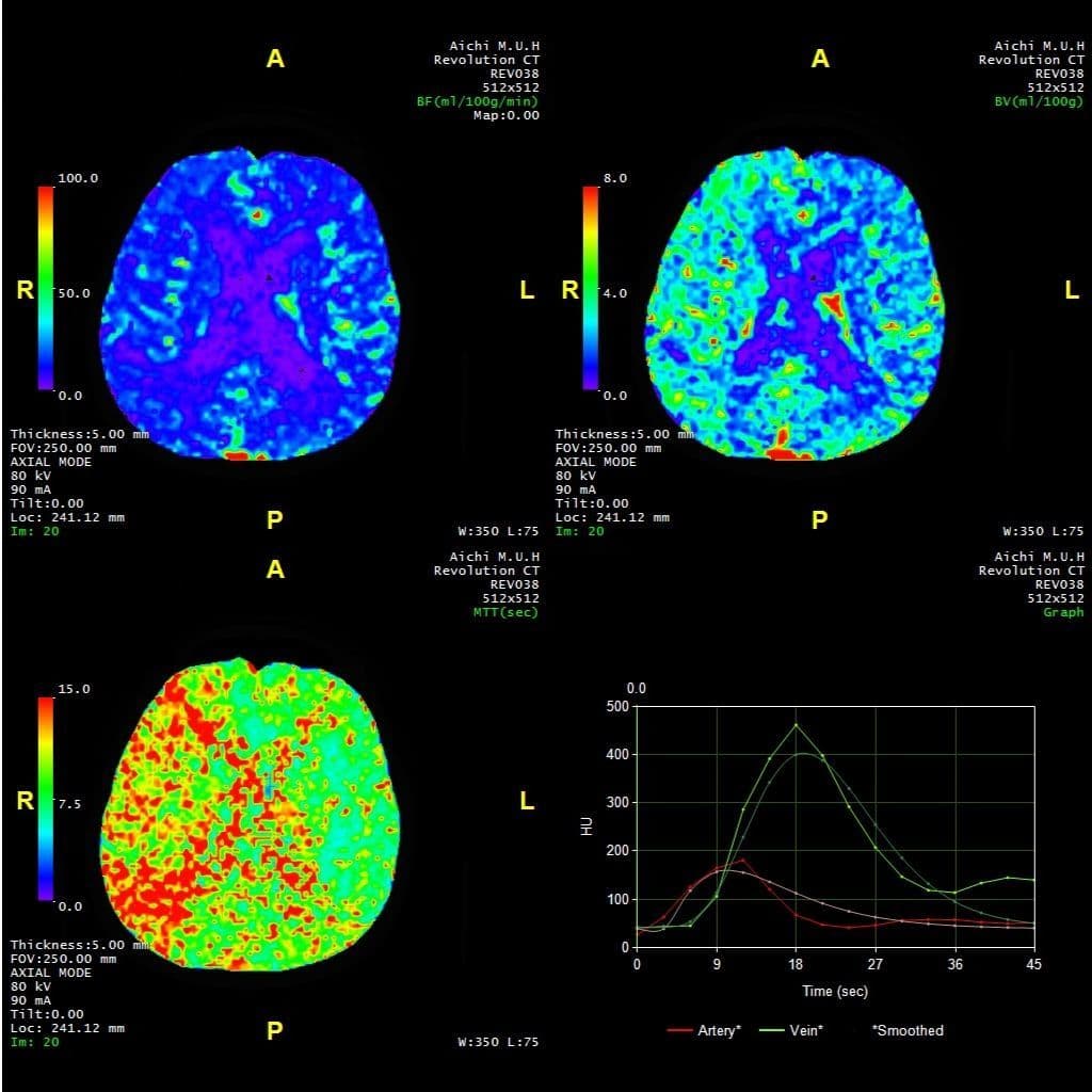 全脳Perfusionとは造影剤を急速静注しながら連続的にCT撮影を行い、CT断面上での吸収値の変化を解析することによって、脳の血流を定量的に評価する検査法です。短時間かつ簡便な手法で精度の高い脳血流情報を得ることができるので、治療方針の決定やその経過観察に有用な検査法です。
