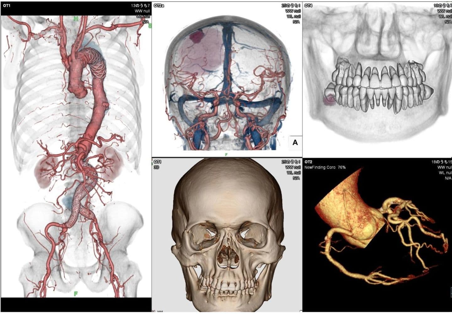 3D画像は撮影したCT画像を立体的に表示できるため、直感的に解剖学的情報や骨折部位などを把握することができ、診断や治療の助けになっています。出血や脳梗塞などによる緊急IVR検査を迅速に正確に行う為にもとても重要な画像です。