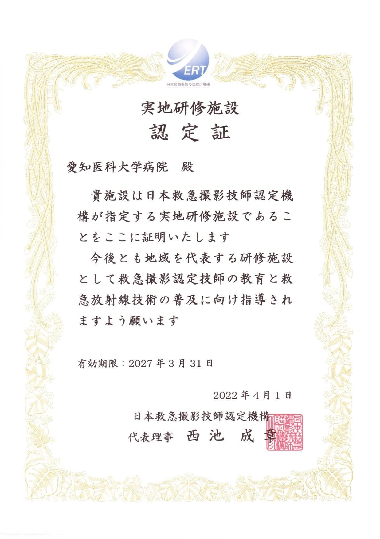 日本救急撮影技師認定機構認定実地研修施設認定証