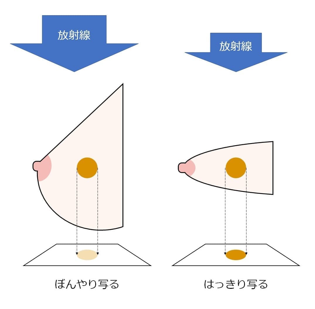 また、乳房の厚みを薄くすることで被ばく線量をより少なくすることができます。 1cm厚みが減ると放射線の量は半分になります。