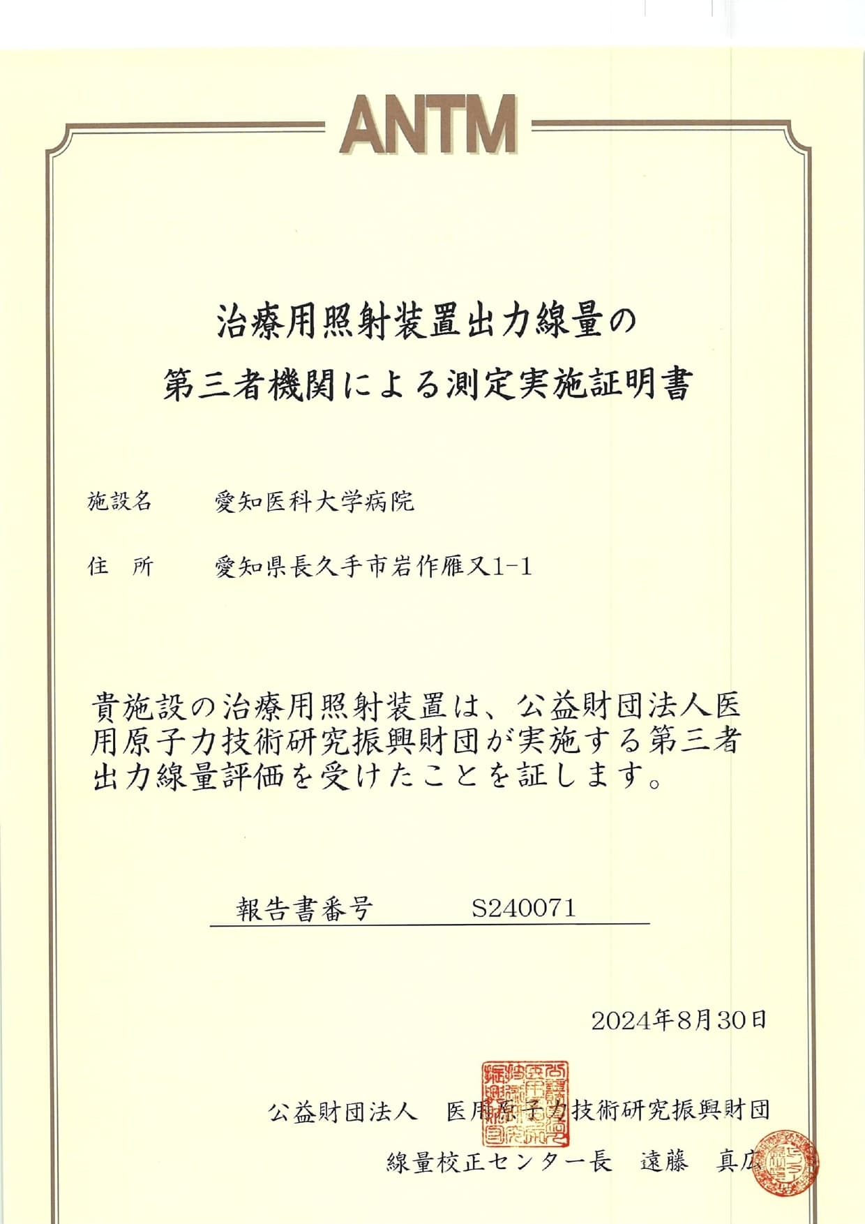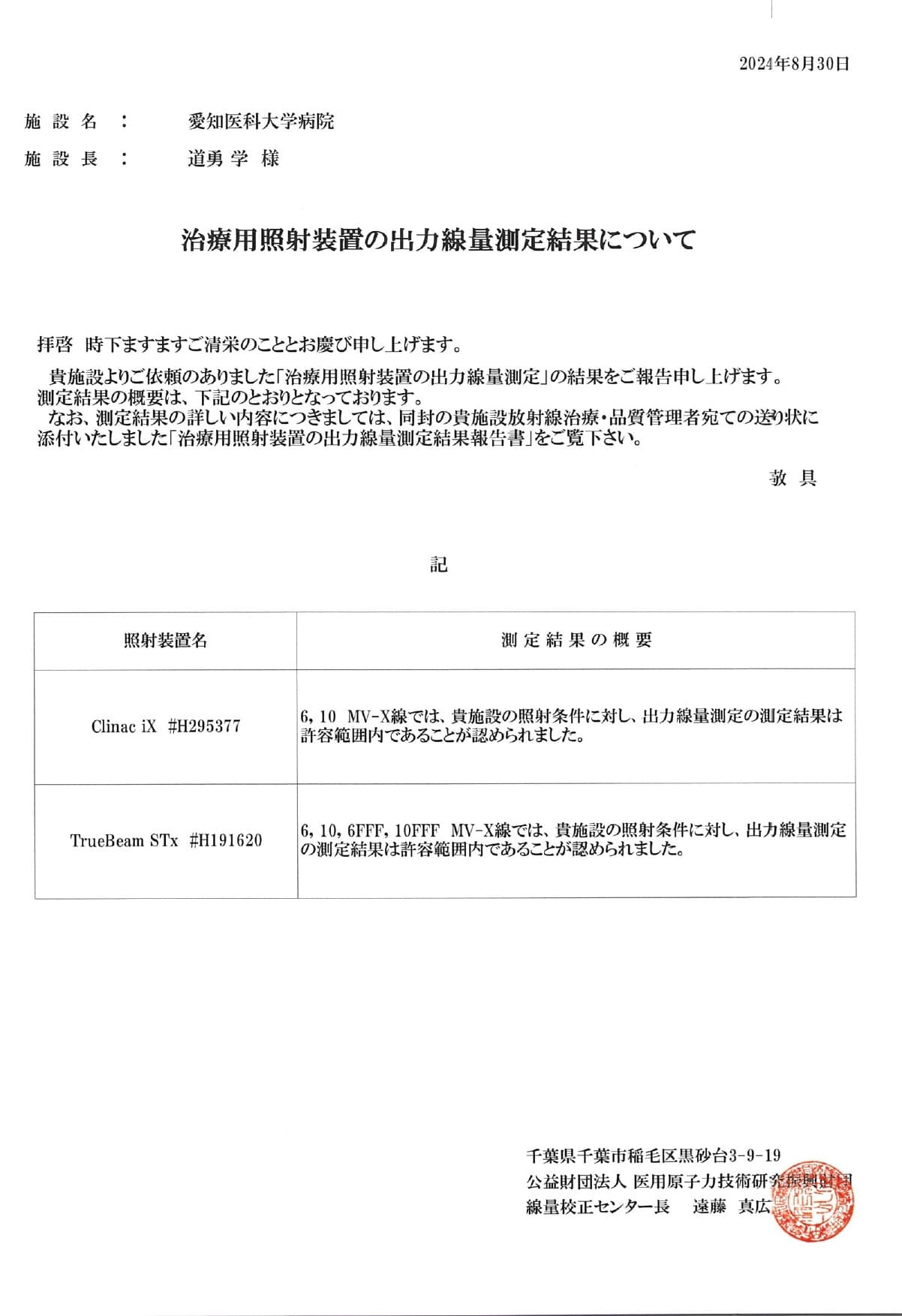日本放射線腫瘍学会が定めるガイドラインにおいて, 放射線治療実施医療機関は, 自施設放射線治療装置の線量精度を担保する責任があり, 3 年に 1 回以上の頻度で第三者出力線量評価認定機関による出力線量評価を実施しなければならない。また, 放射線治療実施医療機関は, 第三者出力線量評価認定機関による出力線量評価の結果が許容範囲外の場合, 原因を究明し対処する責任がある, とされています。