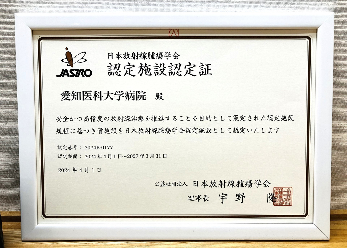 当院は日本放射線腫瘍学会より, 安全かつ高精度の放射線治療を推進することを目的として, 学会の示す診療基準, 認定資格等の人的基準, 設備基準等を満たす施設として認定されています。