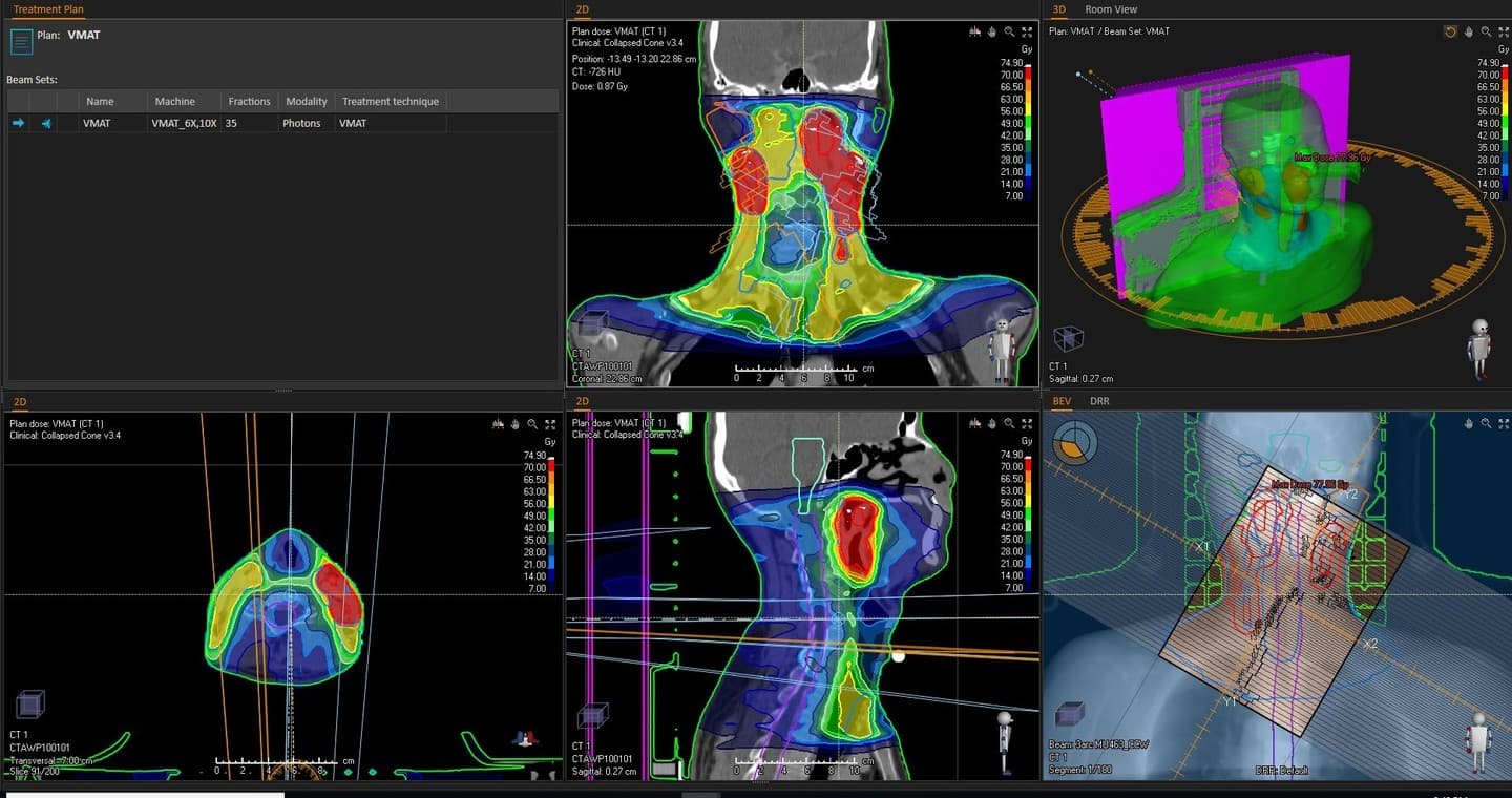 がんなどの治療標的を取り巻く正常組織へ放射線が当たることを避け, VMAT(強度変調回転照射), SRS(定位放射線手術), SRT(定位放射線治療), SBRT(体幹部定位放射線治療)を行っています。